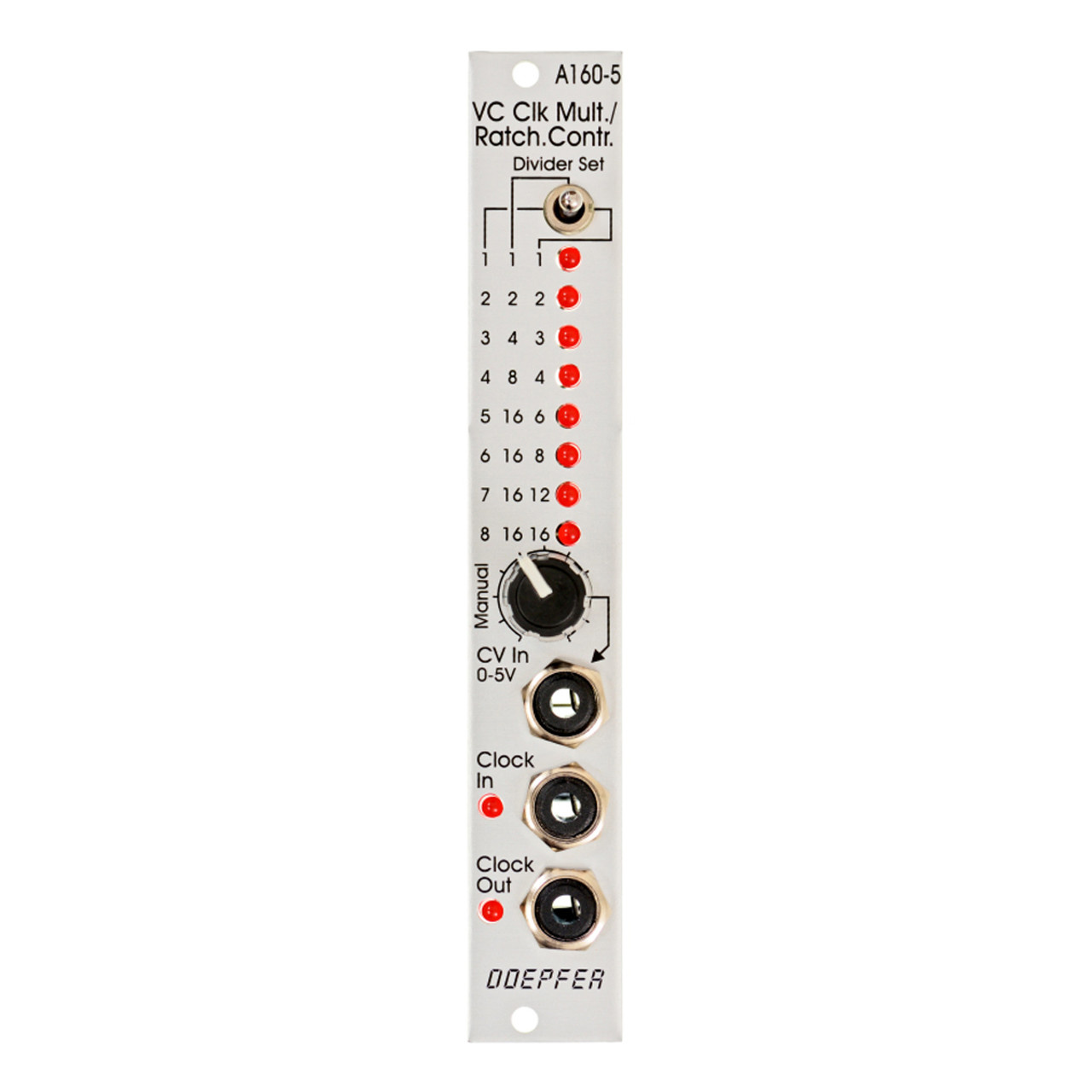 Der A-160-5 von Doepfer ist ein vielseitiger Clock Multiplier und Ratcheting Controller, der modulare Synthesizer um dynamische rhythmische Möglichkeiten erweitert. Er vervielfacht eingehende Clock-Signale auf höhere Frequenzen und ermöglicht so die Erzeugung komplexer, ratcheting-basierter Patterns mit schnellen Notenwiederholungen. Mit einstellbaren Multiplikationsfaktoren und mehreren Trigger-Ausgängen ist dieses Modul ideal für Musiker, die ihre Sequencer und Modulationsquellen mit präziser Timingsteuerung und vielseitigen Performance-Features ausstatten möchten.