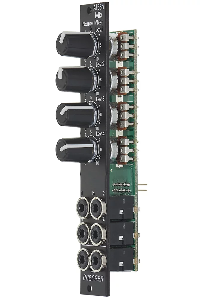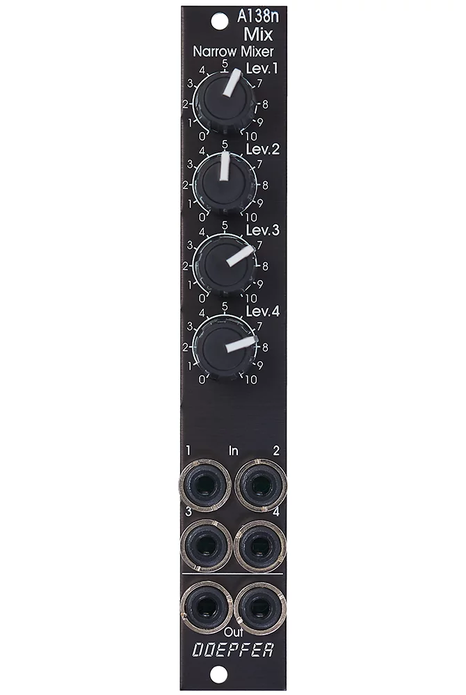The Doepfer A-138nV Narrow Mixer Vintage Edition combines the compact and functional design of the Slim Line Series with stylish vintage aesthetics and premium components. At just 6 HP wide, this 4-channel mixer offers robust and clean mixing capabilities for both audio and CV signals.