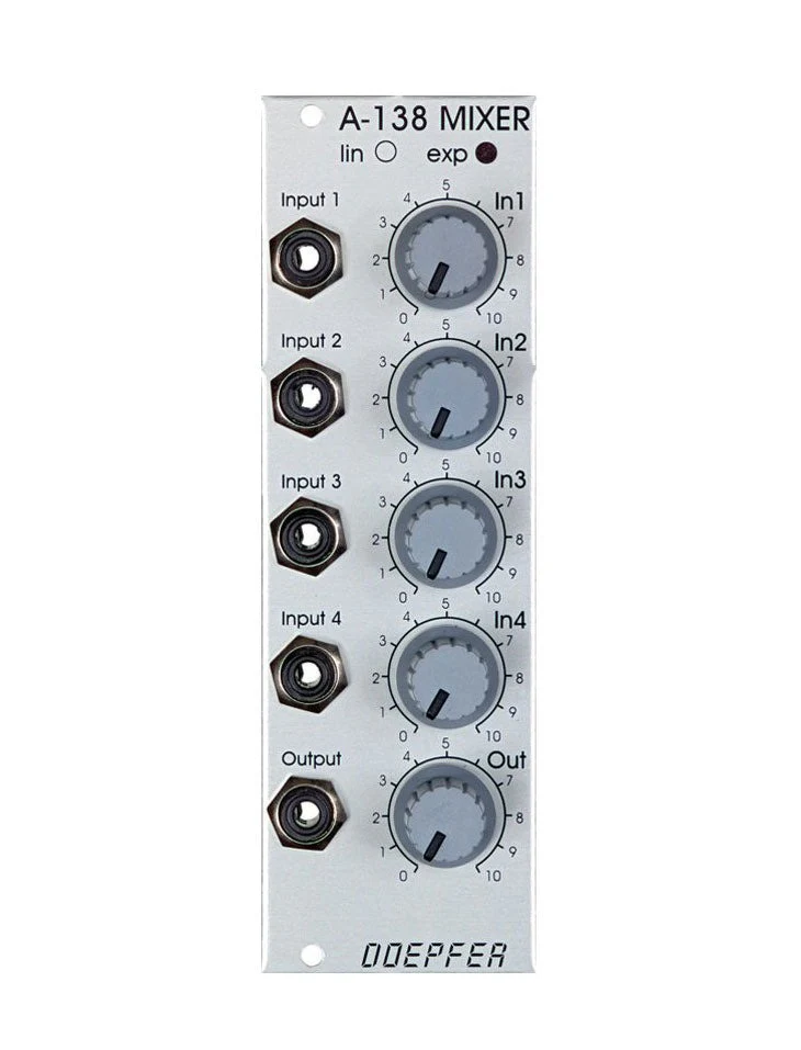De Doepfer A-138b is een 4-kanaals logaritmische mixer, speciaal ontworpen voor het mengen van audiosignalen binnen Eurorack-modulaire systemen. In tegenstelling tot lineaire mixers, biedt deze module een natuurlijke volumecurve die beter aansluit op hoe mensen geluidssterkte ervaren – perfect voor het mengen van oscillatoren, noisebronnen of externe audio.