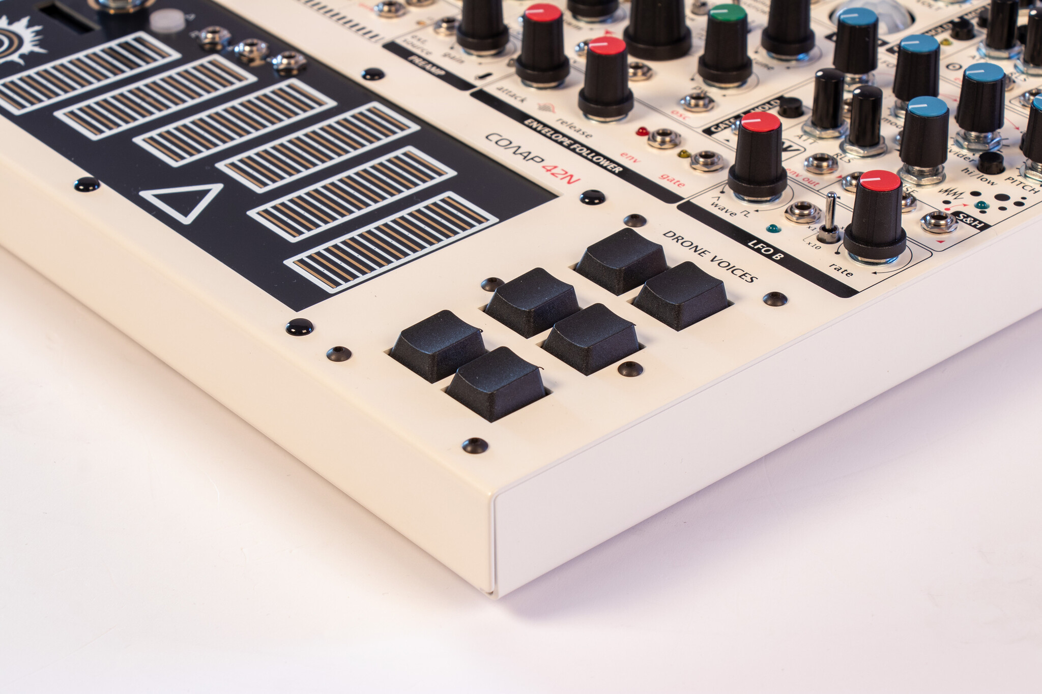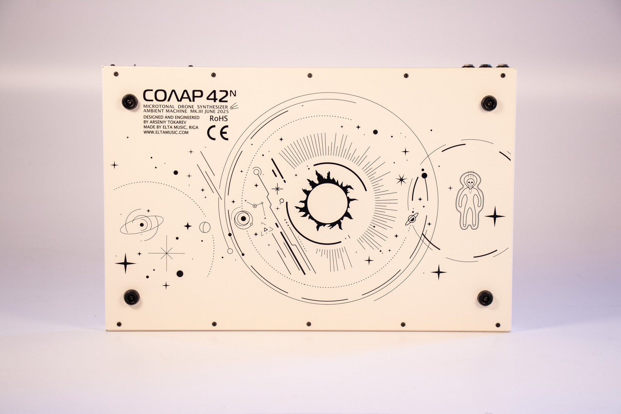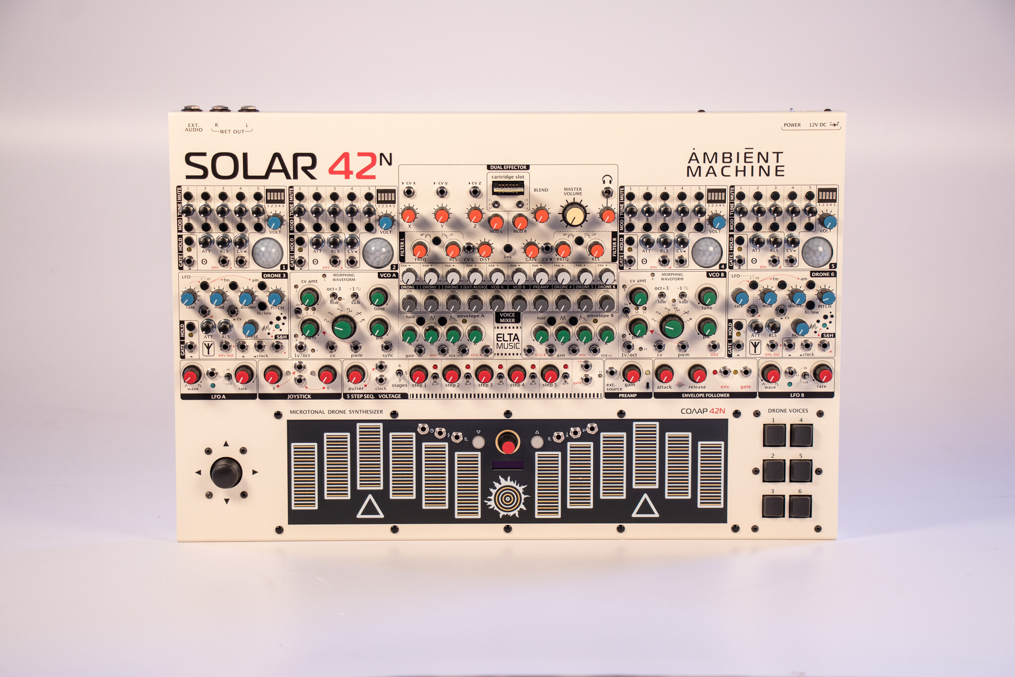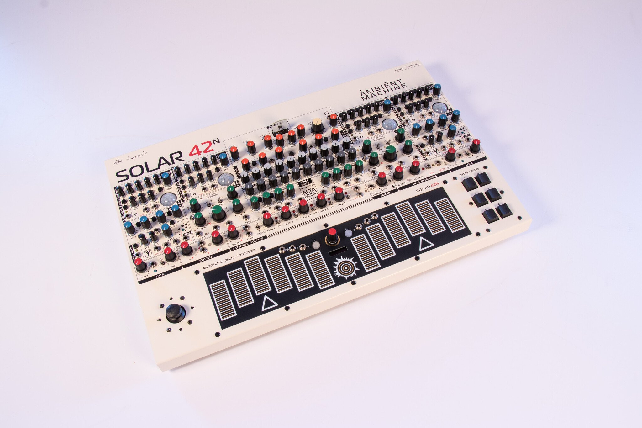 SOLAR-42F is an analogue microtonal ambient drone machine. It is an improved model of the SOLAR 50.